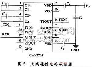通过串口驱动电路中的RS 232电平转换芯片,可以实现单片机和PC机之间的通信,建立人-机对话活动的通道。桑锐公司生产的SRWF-1型无线通信模块工作性能稳定,体积小便于安装。利用MAX3232芯片,能够完成TTL电平和RS 232电平之间的转换,实现通信模块与PC机进行串口通信。其电路原理图如图5所示。