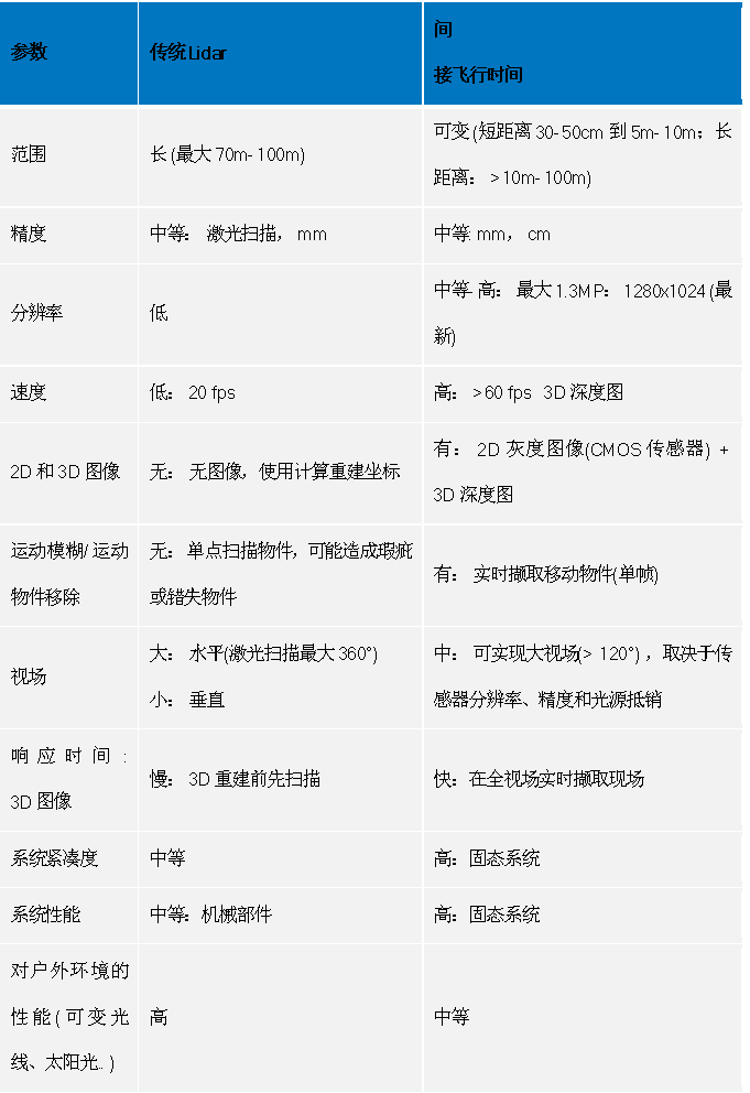 表 2. 传统Lidar 与非直接飞行时间“顶层”比较