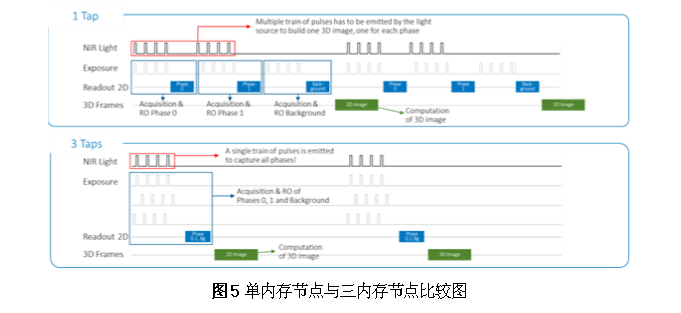 三内存节点像素提供在单帧中建构3D图所需的多相位信息撷取和存储能力,无需像其它非直接飞行时间技术般使用多帧技术。这一技术在快速移动场景应用避免任何运动模糊是非常强大的功能。这类似于2D视觉技术中全局快门和卷闸快门的差异。