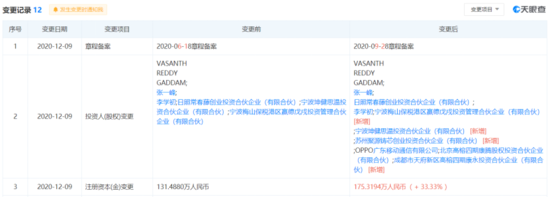 天眼查显示,12月9日,上海瀚巍微电子技术有限公司发生工商变更,新增OPPO广东移动通信有限公司、北京高榕四期康腾股权投资合伙企业(有限合伙)等投资人,同时该公司注册资本由约131万人民币增至约175万人民币。