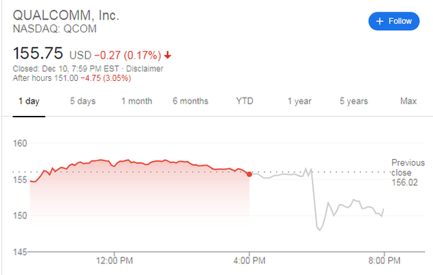 消息一出,高通股价盘后交易一度下跌了 6.3%。