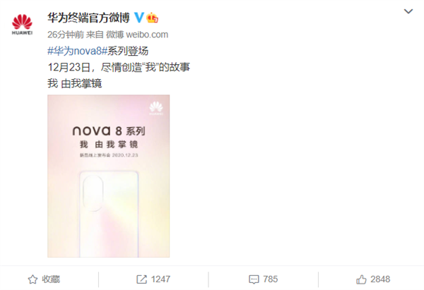 多次爆料之后,今日华为终端官方正式宣布,nova 8系列将于12月23日发布。此次发布会采用线上举办,Slogan为“我 由我掌镜”。