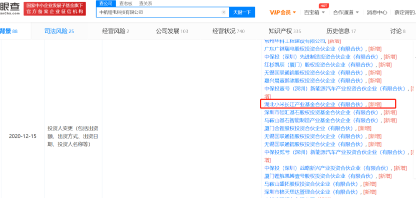 12月15日,中航锂电科技有限公司(简称“中航锂电”)发生投资人变更,新增湖北小米长江产业基金合伙企业(有限合伙)、厦门金锂股权投资合伙企业(有限合伙)、深圳市格天思达管理合伙企业(有限合伙)等。