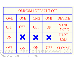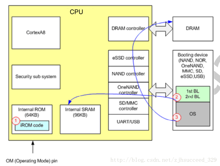 • iROM代码从从指定的启动设备(NAND/SD/NOR等)加载第1阶段boot loader(BL1)到片内96KB的SRAM。启动设备通过OM引脚选择。