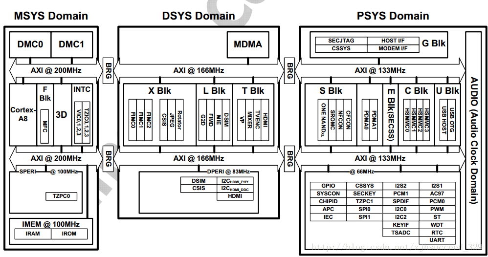 1.MSYS域包括Cortex A8核、DRAM内存控制器、3D、iROM、iRAM、INTC等。