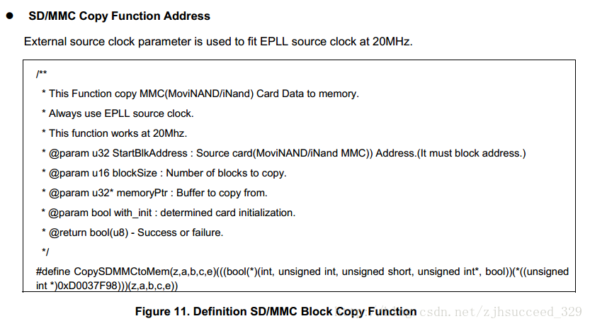 SD/MMC拷贝函数,我的判断是:在iROM从SD卡加载BL1时,使用的就是这个函数,注意里面的关键参数