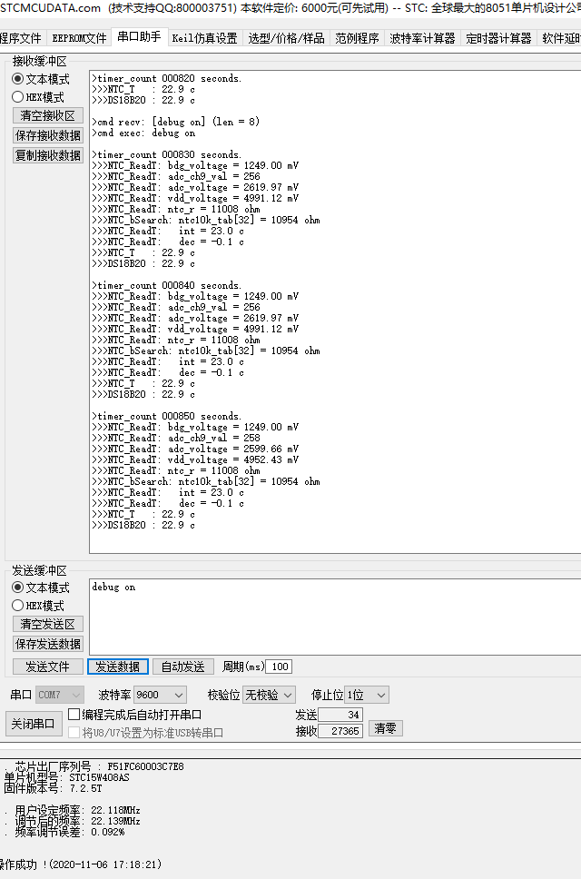 通过 串口助手 可以观察 NTC电阻和DS18B20测试的温度数值对比