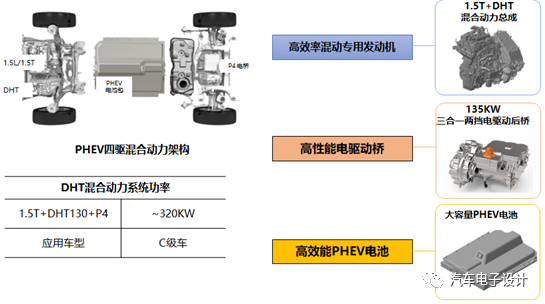 这个柠檬 DHT 的 PHEV 四驱系统,是通过前面两驱+后面布置三合一两档电驱动后桥的方式实现。长城是让 C 级 SUV 车型往 5.2s 的 0-100km/h 加速来做的。