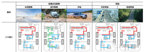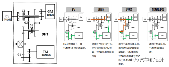 2)混动的模式 目前好几家都开始走本田的技术路线,采用双电机的配置方法,实现纯电、混联、串联、能量回收等多种工作模式,比起单纯的串联模式,从效能来看这么弄还是有优势的。