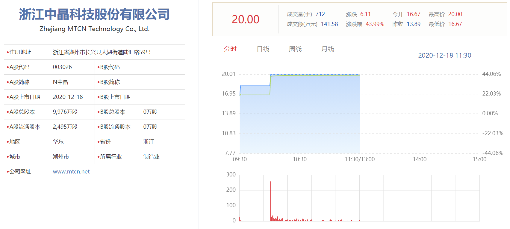 截至午盘,中晶科技股票报价20.00元/股,涨幅达43.99%,总市值达到20.00亿元。