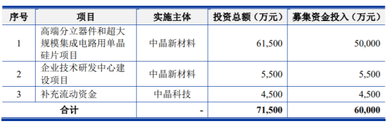 中晶科技本次拟在深交所中小板公开发行新股不超过2494.70万股,占发行后总股本的比例不低于25%,拟募集资金6亿元,其中5亿元用于“高端分立器件和超大规模集成电路用单晶硅片项目”、5500万元用于“企业技术研发中心建设项目”、4500万元用于“补充流动资金”。