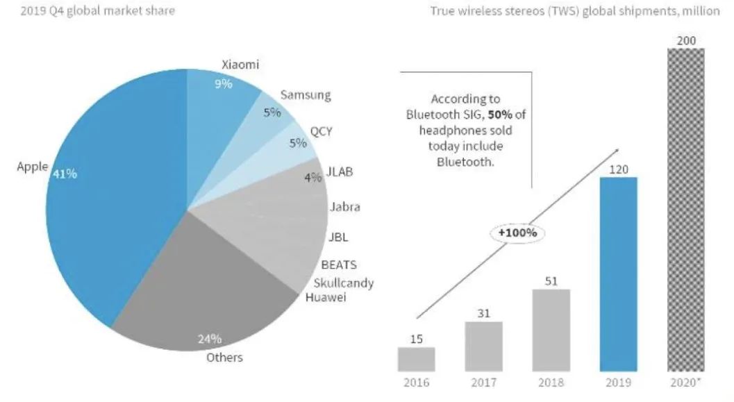这也引发了其他友商的入局和跟进,最终成就了 TWS 市场整体的繁荣。根据 IDC 早前的市场分析,TWS 耳机在过去几年中一直保持着 100%的增长率,2019 年的出货量达到了 1.2 亿台,而 2020 年底有望突破 2 亿台。