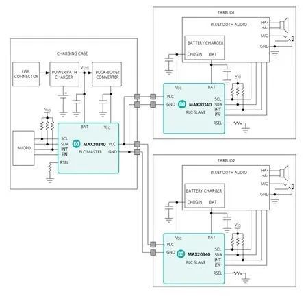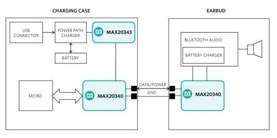 图 4:MAX20340 仅需要两个引脚即可实现耳机和充电盒之间的数据和电源传输(图源:Maxim)