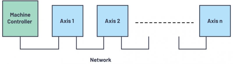 在工业机器人和机床应用中,可能涉及在特定空间内精准协调多个轴的移动,以完成手头的工作。机器人一般有 6 个轴,这些轴必须协调有序,如果有时候机器人沿轨道移动,则会有 7 个轴。在 CNC 加工中,5 轴协调很常见,但是有些应用会用到多达 12 个轴,其中工具和工件在特定空间内相对移动。每个轴都包含一个伺服驱动器、一个电机,有时候,在电机和轴接头,或者末端执行器之间会加装一个变速箱。然后,系统通过工业以太网互联,一般采用 LINE 型拓扑,具体如图 1 所示。电机控制器将所需的空间轨迹转换为每个伺服轴所需的单个位置基准,然后在网络上循环传输。