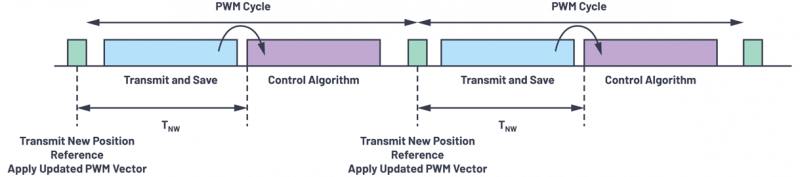 这些应用按定义的周期时间运行,这个时间一般等于,或者是底层伺服电机驱动器的基波控制 / 脉宽调制(PWM)开关周期的几倍。在图 2 所示的这种环境中,端到端网络传输延迟是一个重要参数。在每个周期内,电机控制器必须将新位置基准和其他相关信息传输给图 1 中的各个节点。然后,PWM 周期内需要余留足够的时间,以供每个节点使用新位置基准和任何新传感器数据来更新伺服控制算法计算。然后,各个节点通过依赖于工业以太网协议的分布式时钟机制,在同一时间点将更新后的 PWM 矢量应用于伺服驱动器。根据具体的控制架构,部分控制回路算法可以在 PLC 中实现,如果在网络上接收到任何相关传感器信息更新后,需要足够的时间才能实现。