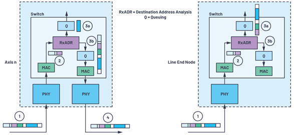 除了带宽延迟外,其他延迟元素是由于以太网帧通过每个伺服网络接口的 PHY 和双端口开关产生的。这些延迟如图 4 和图 5 所示,其中显示帧移动的部分是穿过 PHY 进入 MAC(1-2),通过目标地址分析时,只需要对帧的前导和目标部分进行计时管控。路径 2-3a 表示对当前节点有效载荷数据的截取,路径 2-3b 则表示帧向目标节点行进的路程。图 4a 只显示传输给 2-3a 中的应用的有效载荷,图 4b 则显示被传输的帧的大部分;这表明以太网协议之间可能存在细微的差异。路径 3b-4 表示帧出站传输,通过传输队列、通过 PHY,然后回到线缆。图中所示的线路终端节点中不存在这种路径。这里假设采用直通数据包交换,而不是存储转发,后者的延迟时间更长,因为整个帧都要计入开关,然后再被转发。