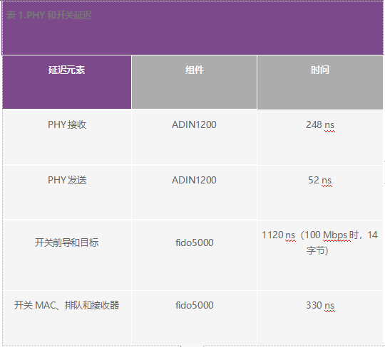 表 1 列出了 PHY 和开关导致的延迟,前提是假设接收缓冲器分析是以目标地址为基础,且假设采用 100 Mbps 网络。