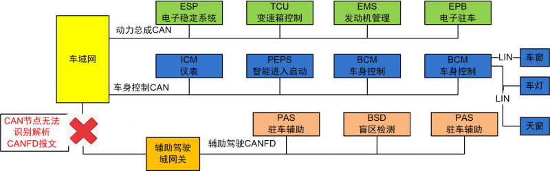 随着新一代智能汽车的发展,很多车厂都在考虑使用 CAN FD 来替代 CAN 实现数据量传输的提速。目前各大车厂并未完全实现车载域控制,在生产线或实验室存在 CAN 与 CANFD 并存的现象,例如,新一代智能汽车 ADAS 系统中毫米波雷达等设备需要采用 CANFD 提高通讯速率,保证安全驾驶。同时,ADAS 也是目前智能汽车中最为重要的一环。如图 2 所示,在现有的整车系统中以 CAN 网络为主,在调试阶段 ADAS 系统无法与动力控制、车身控制通讯,所以打通 CAN 与 CANFD 之间的通讯极为重要。