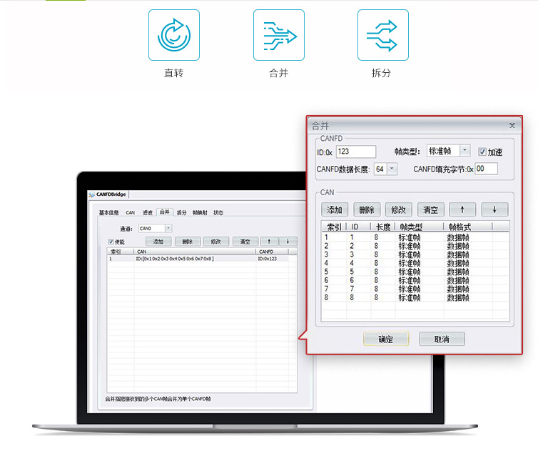 采用直转、合并、拆分三种方式实现传统 CAN 的 8 字节长度和 CANFD 的 64 字节长度的相互转换,无损还原原有数据。