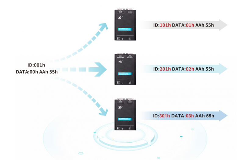 CANFDBridge 支持 ID 与数据的转换映射,可以把输入的报文进行特定 ID 和数据的转换输出,实现相同设备的联网接入。