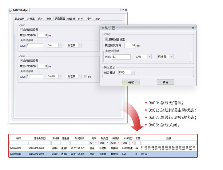 CANFDBridge 具备发送错误信息回传功能,让本侧设备获知另外一侧的总线运行情况,提高故障预警能力。