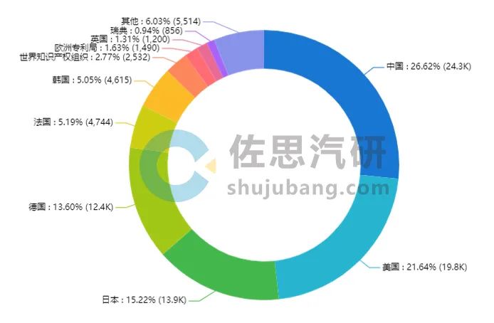 这些专利主要来自于中国(26.62%),美国(21.64%),日本(15.22%),德国(13.6%),法国(5.19%),韩国(5.05%)等国家。