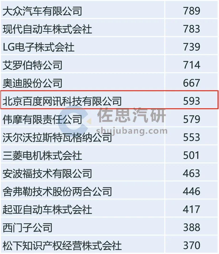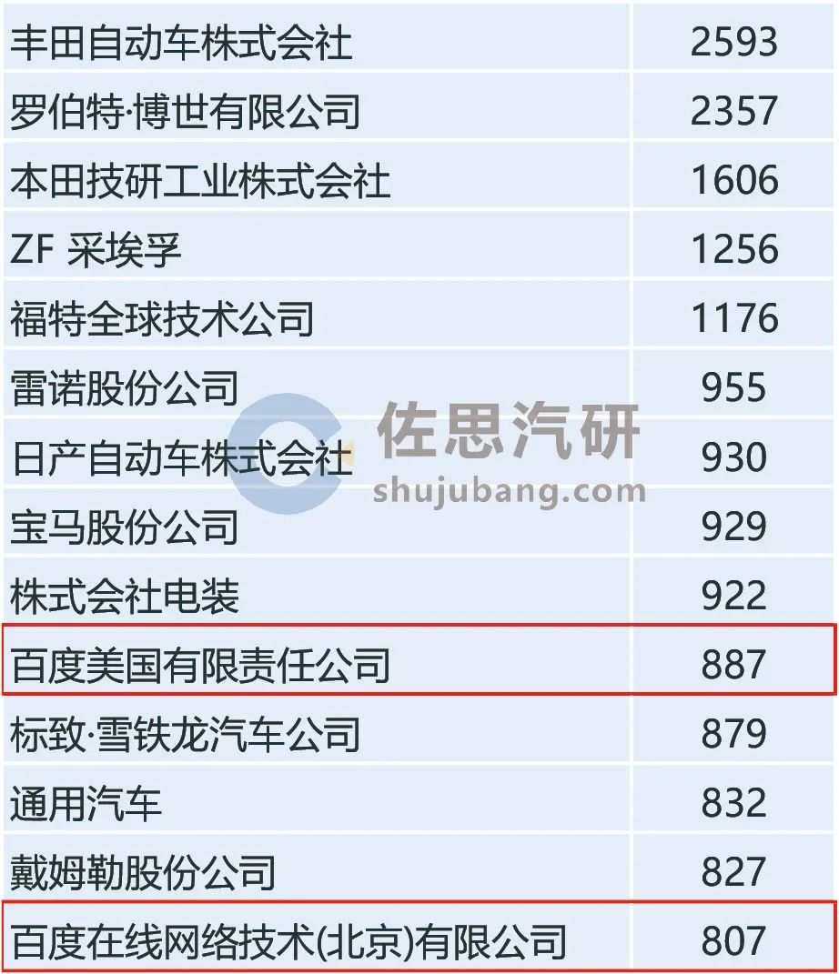 基于“无人车、无人驾驶、自动驾驶”关键词的专利检索结果,专利申请前 50 名企业中,国内只有百度(超过 2000 件)、华为(246 件)上榜,其他均为国外企业。