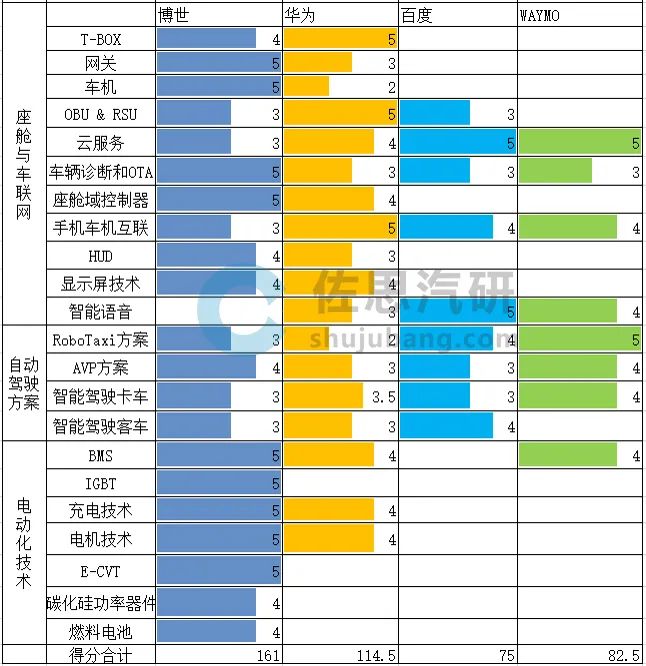 从布局细分领域的数量和初步评分来看,四家企业的竞争力排名依次为:博世、华为、WAYMO、百度。