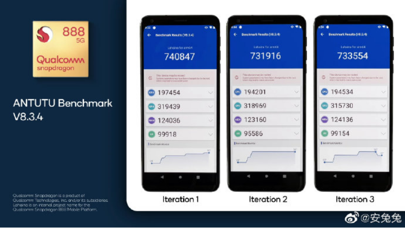 12月19日消息,高通在昨天公布了一段骁龙888参考设计样机的跑分视频。在视频中,高通共使用骁龙888参考设计样机进行了三次安兔兔跑分,成绩分别是740847分、731916分以及733554分。
