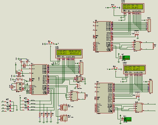 从图10-4仿真图可以看出从机1当前的温度值为42.0℃,从机2当前的温度为34.0℃,温度报警上限温度值为39.0℃,主机与从机显示温度一致,说明Proteus仿真是完全正确的。