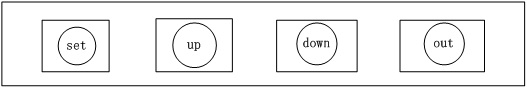 按键功能如图10-7所示,当set键按下时进入调整模式,并且可以通过set键切换进入对温度上限值、时间、星期、年月日的调整状态。当进入某种调整状态时其对应值会快速闪烁,通过up键或者down键进行调整。调整完毕后按下out键保存并退出调整模式。