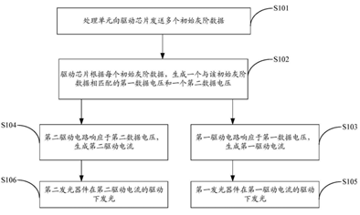 上述移动终端01的驱动方法如图3所示,首先处理单元21向驱动芯片13发送多个显示某一帧画面时的灰阶数据(S101),此处的灰阶数据,是指待显示图像对应的原始未进行处理的灰阶数据。接着,驱动芯片13根据每个初始灰阶数据,生成与其相匹配的第一数据电压Vdata1和第二数据电压Vdata2(S102)。然后两个驱动电路分别响应以上两个电压,并生成对应的驱动电流Isd1和Isd2,以此驱动对应的发光器件(S103-106)。