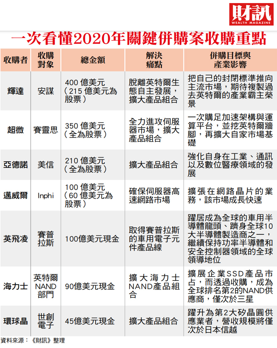 影响所及,以股票直接收购的方式也占大部分收购金额。强势的股价成为超微与辉达这类收购者最好的收购武器与诱因。
