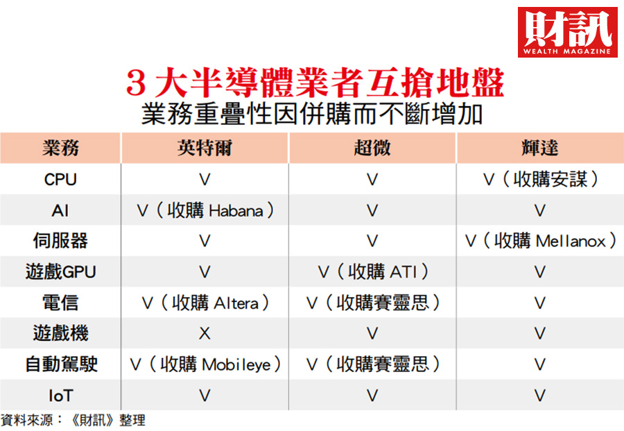 就目前来看,除了第 6 大并购案,也就是海力士并购英特尔 NAND 存储器事业,是由英特尔想切割既有事业部门的结果,其余辉达并购安谋、超微并购赛灵思、迈威尔并购 Inphi,最大目标都是为了打入英特尔主导的服务器领域,甚至亚德诺(ADI)买美信(Maxim)及英飞凌(Infineon)买赛普拉斯(Cypress),也都是要针对未来的云端运算、5G 及自动驾驶等领域的需求而来,间接或直接与英特尔产品线相关。
