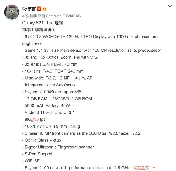 在对骁龙888新一代旗舰平台新品的推进力度上,三星可以说是不遗余力。网上关于三款新机的爆料也铺天盖地袭来。今日,某微博数码博主曝光了三星Galaxy S21 Ultra的基本全部规格信息,基本上毫无悬念的都是新一代机皇该有的巅峰属性,不过其少说也得过万。