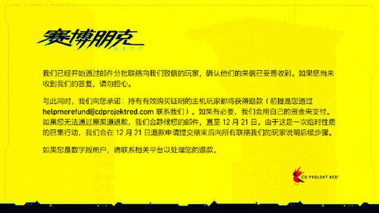 此外,索尼表示:“为了确保客户满意度,我们允许所有《赛博朋克2077》购买者在PlayStaion平台全额退款。我们也会在PlayStaion商城下架《赛博朋克2077》。当您申请退款,一旦我们确认您在PlayStaion商城购买了《赛博朋克2077》这款游戏之后,我们就会开始安排退款事项。请注意,您的退款完成方式会随着您的支付方式和账户状况而有所变化。”