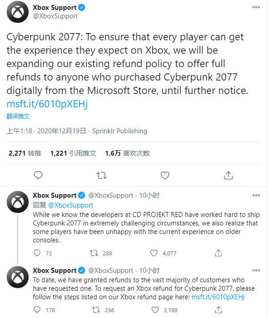 Xbox宣布在微软商城购买数字版《赛博朋克2077》的玩家可以进行退款。微软宣布:“为了确保每一位玩家都能在Xbox上获得他们所期待的体验,我们将扩大现有的退款政策,为任何从微软商店购买《赛博朋克2077》数字版游戏的玩家提供全额退款,直到另行通知。虽然我们知道CD PROJEKT RED的开发者们在极富挑战性的情况下努力出货《赛博朋克2077》,但我们也意识到一些玩家对目前在老式游戏机上的体验感到不满。到目前为止,我们已经对绝大多数要求退款的客户给予了退款。”