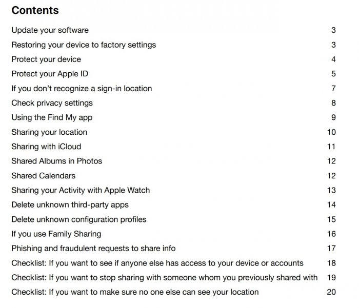苹果公司在文件中说:“如果你想重新审视你与其他人分享的内容,或者因为任何原因恢复设备的出厂设置,这份指南可以帮助你了解你通过苹果设备分享了哪些信息,以及如何做出改变以保护你的安全。它包括如何删除别人对你之前授予的信息的访问权的逐步说明,从查找App上的位置数据,到你通过日历安排的会议等。”