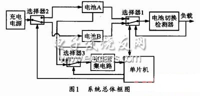 供电电路由电池A、电池B、选择器1、电压检测器和单片机组成。供电时,单片机控制选择器1与主电池A接通,使主电池A供电而备用电池B挂起。电压检测器内部设置有标识系统正常工作的参考电压,若输入电压高于此参考电压,则电压检测器输出给负载的电压等于输入电压,且此时反馈控制信号不触发选择器;若输入电压低于参考电压,则输出低电平,触发选择器3选择另一电池供电,这样依次循环自动切换电池来供电。充电电路包括电池A、电池B、充电电源(交流适配器或者USB电源设备)、选择器2和单片机。当单片机检测到两正常电池某一个在供电时,将控制选择器2使充电电源接人另一电池充电;当设备中任一电池电压处在低于截止电压2.75V或等于0V电池被摘除的状态时,单片机将控制选择器2使充电电源只对供电电池充电。电压检测电路由电池A、电池B、选择器3、电压采集电路和单片机组成。单片机控制选择器3使电池A、B分时接入电压采集电路,再通过内置的AD转换器,模拟型的电压信号就可变换为数字信号供单片机处理。