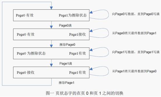 下图以采用两个页模拟EEPROM的方式为例,描述了页状态字的在页0 和页1 之间的切换过程。