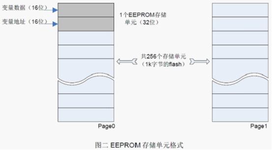 下面的图例以采用两个页模拟EEPROM 的应用方式为例进行描述。为了方便获取模拟EEPROM数据和更新数据内容,每个存储变量元素都在Flash 里定义了一个操作单元,在该操作单元中对每个存储变量元素都分配一个虚拟操作地址,即一个EEPROM 操作单元包含一个虚拟地址单元和一个数据单元。当需要修改数据单元内容时,新的数据内容和之前分配的虚拟地址一同写入一个新的模拟EEPROM存储器单元中,同时返回最新修改的数据内容。EEPROM存储单元格式描述如图二。
