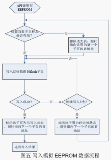 调用API,向模拟EEPROM 写入数据的软件流程如图五所示。在软件处理中,要特别注意目标指针的切换和保证写入数据的正确性,在代码空间允许的情况下,可以增加一些校验算法来保证。