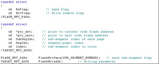 • FlashWrite()用于写Flash,传递的形参包括指向待写入数据的指针,待写入数据在子页中的起始字节编号,写入数据的长度,原型如下。