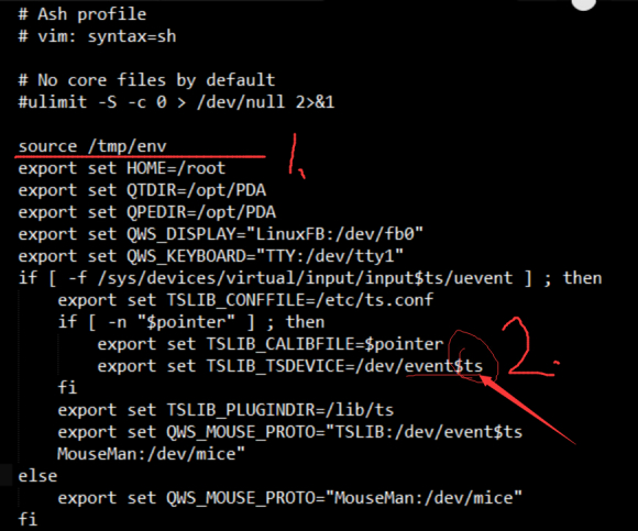 -no-tslib,表示不把tslib作为input库,此时触摸屏默认以evdev作为input库,所以移植完过后在开发板的/etc/profile文件中添加: