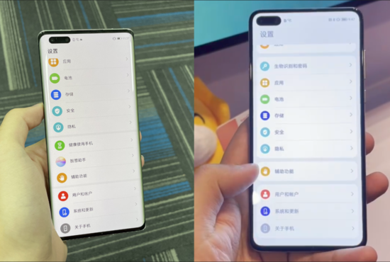 我们再来看一张对比图,左侧为搭载 EMUI 11 的 Mate 40 Pro,右为搭载 HarmonyOS 2.0 的华为手机。从这两张图片不难看出,两者在操作界面上没有本质不同,不管是电池、存储、安全、隐私等图标,还是全面屏手势操作逻辑,HarmonyOS 2.0 都和 EMUI 11 相仿。