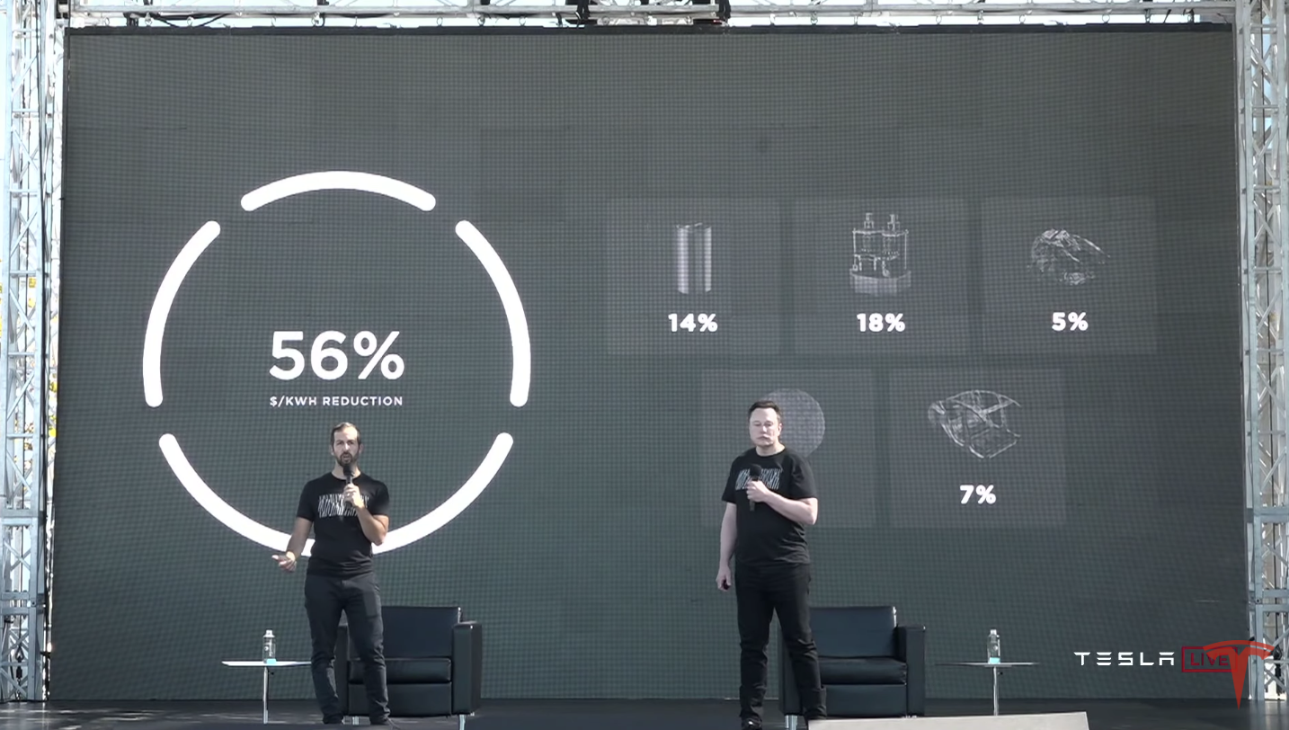 降低电池成本,是电动车进行大规模普及、售价逼近燃油车甚至更低所面临的最大难题。一向以成本杀手著称的伊隆·马斯克深谙此道,特斯拉从弱小走向无敌的进程就是马斯克对极致成本的追求。按照马斯克在今年电池日的说法,特斯拉从第一性原理出发,致力于降低电芯设计、电芯制造、阳极材料、阴极材料、电芯集成等全电池价值链成本,最终要在2023年将电池组的成本降低56%至60美元/千瓦时。