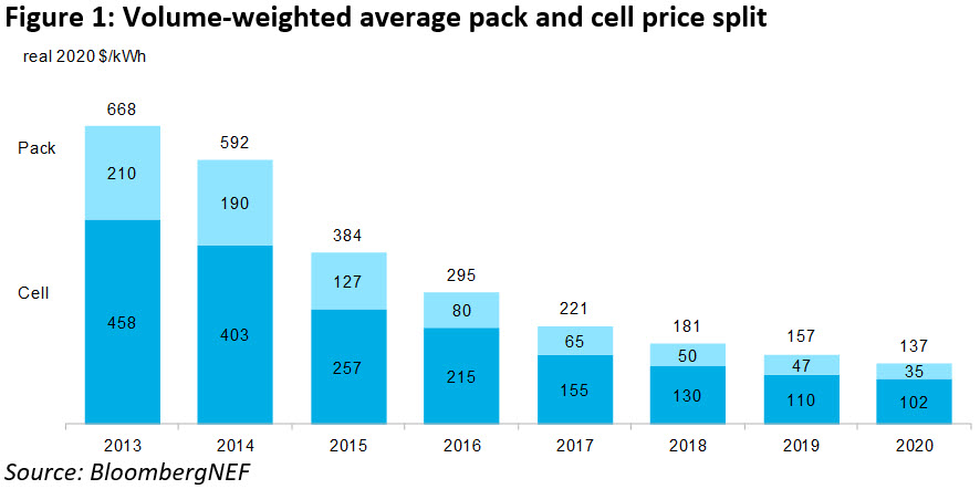 电池组价格之所以能在2020年大幅降低,BNEF指出是因为订单量的增加,纯电动汽车销量的增长以及新电池包设计的引入等因素。此外,新阴极材料和制造成本的下降都将会在短期内进一步推动电池组价格的下降。还有一个利好因素是,阴极材料的价格自2018年春季达到高点以来就一直在下降,在2020年达到了更加稳定的水平。