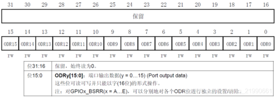 ODR 是一个端口输出数据寄存器,也只用了低 16 位。该寄存器为可读写,从该寄存器读出来的数据可以用于判断当前 IO 口的输出状态。而向该寄存器写数据,则可以控制某个 IO 口的输出电平。