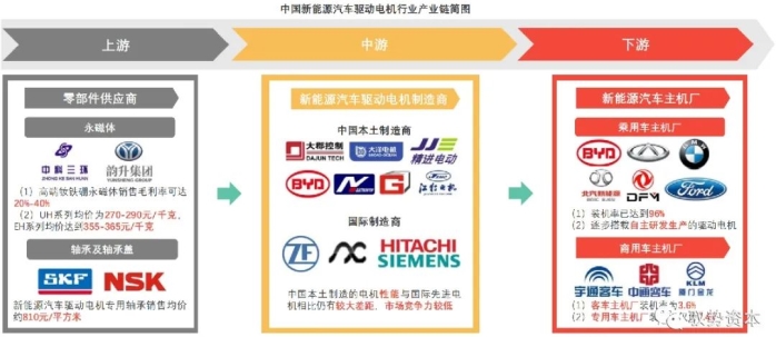 中国新能源汽车驱动电机行业产业链由上游永磁体、轴承等零部件供应商,中游新能源汽车驱动电机制造商及下游新能源汽车主机厂组成。
