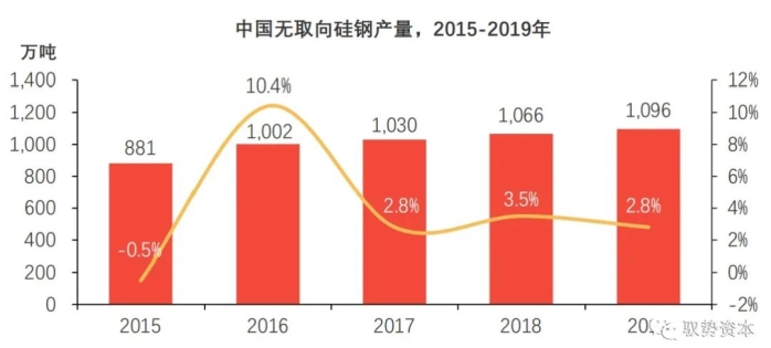 此外,新能源汽车驱动电机生产所需的无取向硅钢(Si≥0.5%的电工钢)产量持续提升。据中国金属学会电工钢分会数据显示,2019年中国无取向硅钢产量达到1,096万吨,同比增长2.8%。无取向硅钢广泛应用于铁芯等电机零部件,其产量的持续提升导致市场竞争愈发激烈,价格进一步降低,从而有效减少新能源汽车驱动电机行业内企业的成本支出。